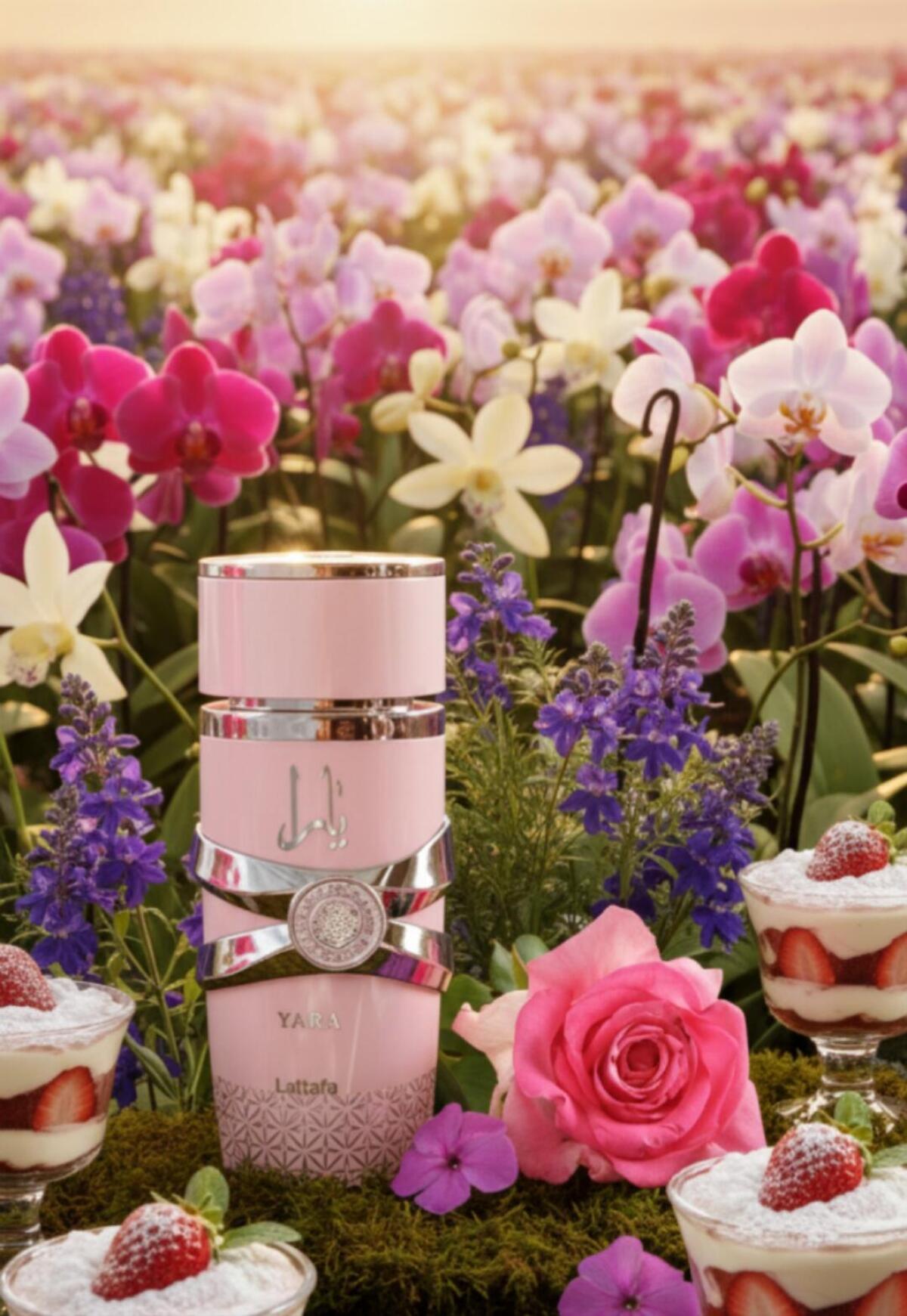 Yara by Lattafa Perfumes is a Amber Vanilla fragrance for women. Yara was launched in 2020. Top notes are Orchid, Heliotrope and Tangerine; middle notes are Gourmand Accord and Tropical Fruits; base notes are Vanilla, Musk and Sandalwood.